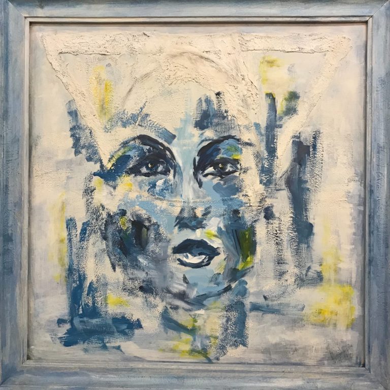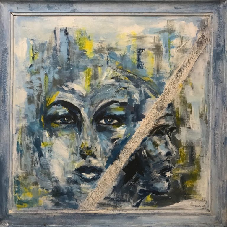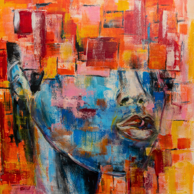 Das Kunstwerk „Verblendung“ zeigt ein Gesicht mit verdeckten Augen – als Symbol für innere Verschleierung und Schutzmechanismen.